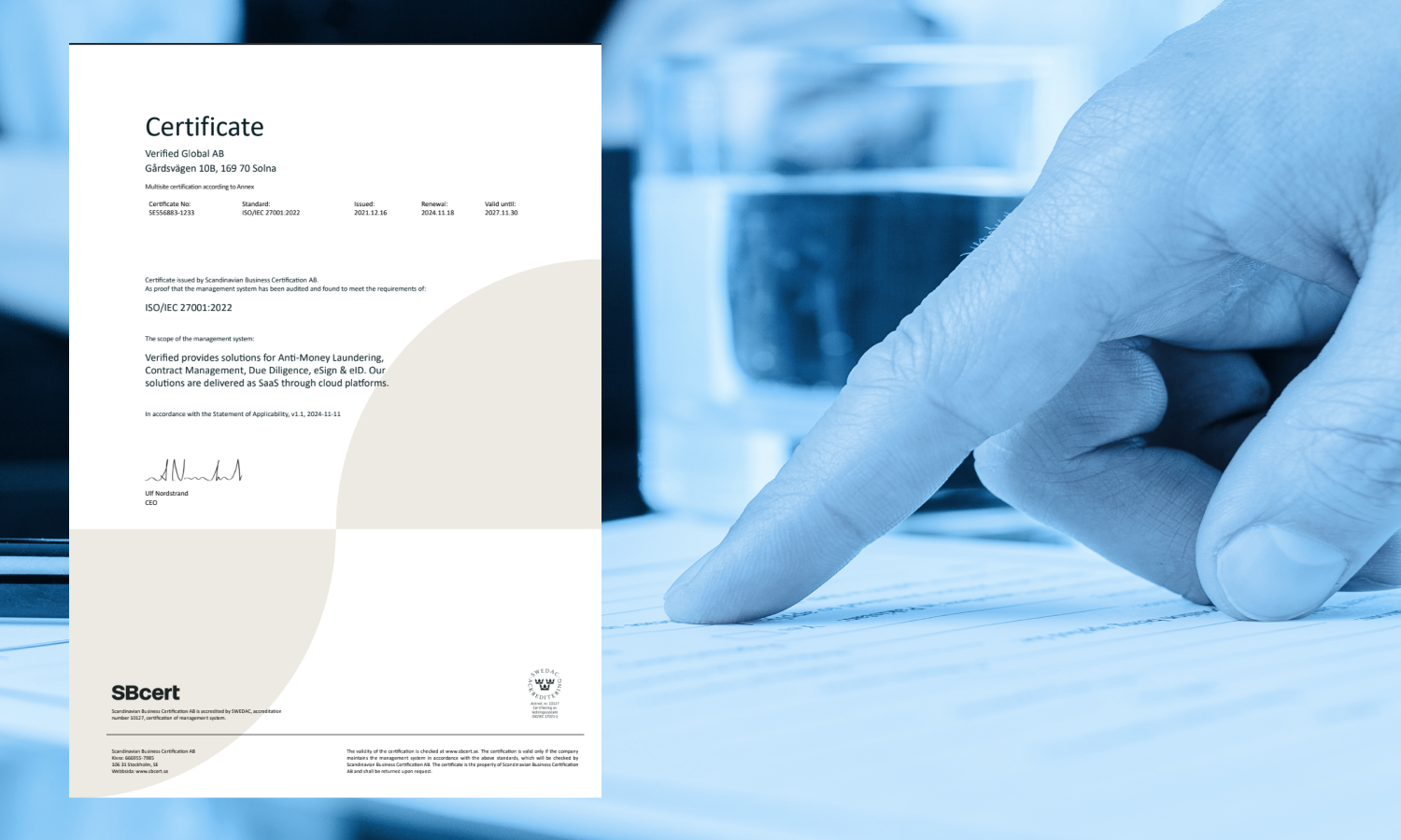 At Verified, we've covered every essential aspect: AML & KYC, Contract Management, eSign & eID, and Data all together. Our mission is to provide seamless digital solutions, empowering regulatory businesses across the Nordics. Experience smooth customer onboarding, robust anti-money laundering compliance, and simplified document and contract management.